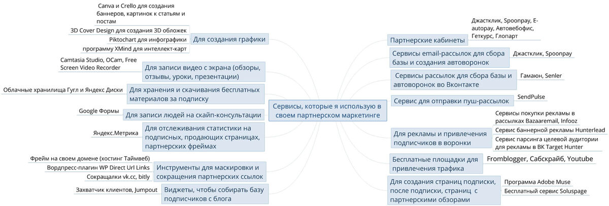 Привет! В партнерском маркетинге мы используем различные сервисы – те, на которых находятся партнерские кабинеты, сервисы для привлечения трафика, набора подписной базы, создания воронок и много чего другого… Мне задавали вопрос – какими сервисами я пользуюсь в своей работе с партнерками. Поэтому я на него ответила и составила список своих сервисов, сгруппировала их по задачам и пояснила, зачем мне тот или иной инструмент. Получился перечень из более чем 25 сервисов. Для наглядности я составила по ним интеллект-карту. А более подробно и с пояснениями рассказала о них на своем блоге. Если вам интересно взять что-то на заметку, заглядывайте. Также в комментариях напишите, какими вы пользуетесь сервисами.:)