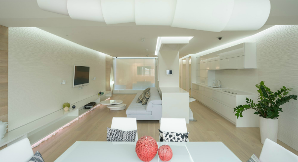 Дизайн квартиры в белом цвете – воздушный, невесомый, наполненный светом и воздухом, с единым пространством холла, кухни и зала. Ломаные плоскости потолков слегка нарушают идиллию, добавляя динамики. Дизайн квартиры в белом стиле с белым светом, зеркалами, глянцевыми поверхностями, неровными стенами и потолком поначалу сбивает с толку – непонятно, каковы же истинные размеры жилища. Белый цвет дополнен эко-материалами: деревянные полы, переходящие в стены, округлые речные камни. На основной стене гостиной и стене кухни – керамогранит с природным рисунком и рельефом. Белый дизайн квартиры таит множество неожиданностей: двери в спальню и детскую похожи на замаскированные ходы в тайные комнаты. Белый интерьер квартиры продолжается и в детской, но дополнен нежно-зеленым цветом. Декорированная панель двухэтажной кровати – в то же время приспособление для игр, учебы и отдыха. Во взрослой спальне дизайн квартиры в белых тонах подчеркнут гипсовым панно на стене у изголовья. Ванная комната отд