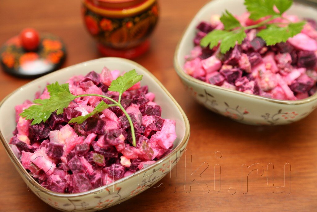 Ингредиенты: Для салата: Для соуса: Способ приготовления: Отварить до готовности свеклу и картофель в кожуре. Остудить и почистить. Сельдь, свеклу, картофель, огурцы и лук нарезать небольшими кусочками. Укроп мелко порубить, оставив несколько веточек для украшения. Для соуса хорошо перемешать все ингредиенты, посолить и поперчить по вкусу. Смешать в салатнице овощи и сельдь, заправить соусом и подавать, украсив оставшейся зеленью.