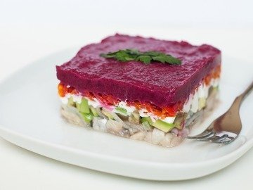 Пошаговое описание рецепта 1. Одну небольшую луковицу тонко нарезать полукольцами, поместить в миску и залить кипятком с уксусом в пропорции 1:1, чтобы лук был полностью покрыт. Оставить на 1 час. 2. Натуральный йогурт слегка посолить и поперчить по вкусу, перемешать. 3. Мелко нарезать селедку и выложить нижним слоем. Совет Можно взять обычную соленую селедку, но я обычно использую уже готовую, очищенную и слегка маринованную селедку. Так и проще, и вкуснее. 4. Вторым слоем выложить отжатый маринованный лук. 5. Нарезать авокадо кубиками, выложить поверх лука. 6. Слой авокадо покрыть тонким слоем йогурта. 7. Морковь отварить, очистить, натереть на мелкой терке и выложить поверх йогурта. 8. Желатин замочить в небольшом количестве воды и оставить на 10 минут. 9. Свеклу отварить до готовности, очистить, натереть на терке. Добавить 2 ч. л. натурального йогурта и пюрировать массу блендером. 10. Желатин распустить на водяной бане и добавить к свекле, хорошо перемешать. 11. Выложить свекольн