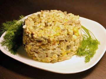 Соединить обжаренную массу со сковороды с курицей, кукурузой и яйцами. Посолить, добавить майонез и перемешать. 5. Грибной салат с курицей и кукурузой подавать на стол, предварительно остудив в холодильнике в течение пару часов.