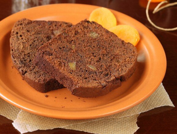Кекс по рецепту Пьера Эрме. Немного рассыпчатое тесто с имбирными цукатами и курагой. В пищевой плёнке хранится 5 дней при комнатной температуре. В морозилке он может пролежать в течение 1 месяца (перед употреблением нужно будет его разморозить). Ингредиенты: 180 г муки 40 г какао 1/2 ч. л. разрыхлителя 100 г кураги, порезанной на кусочки 150 г сахара 140 г миндаля, измельчённого (на тёрке) 4 яйца 150 г цельного молока 70 г тёмного шоколада, порезанного на мелкие кусочки 50 г имбирных цукатов, порезанных на мелкие кубики 180 г сливочного масла, растопленного курага для украшения Приготовление: Разогрейте духовку до 180°С. Смажьте маслом форму (длиной 28 см) и застелите бумагой для выпечки. Просейте муку, какао и разрыхлитель. Вскипятите 250 г воды, залейте ей курагу и дайте постоять 1 минуту. Затем слейте воду и просушите курагу бумажной салфеткой. В миксере с насадкой "нож" на средней скорости смелите сахар и миндальную пасту до состояния крошки. Добавляйте яйца по одному, взбив