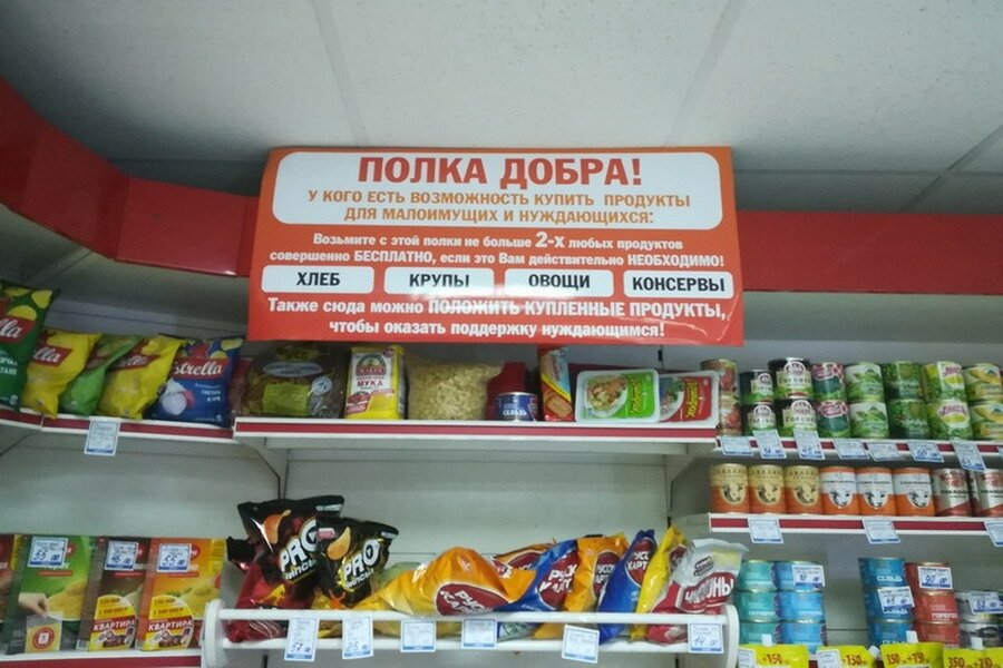 В одной из торговых точек нашего города презентовали «Полку добра» с продовольственными товарами для малоимущих и нуждающихся. Автором необычной задумки стал многодетный отец Виталий Никитин. Ее охотно поддержала администратор магазина, расположенного на улице Полетаева, 2, Татьяна Картушева. Она-то и помогла воплотить задуманное в жизнь. — Неравнодушные люди покупают и оставляют продукты в нашем магазине. Мы тут же выкладываем их на полку. Идея давно витала в воздухе. Знаю, в том же Дагестане такие проекты не редкость. Среди городов нашего региона практика прижилась в Магнитогорске, — делится Татьяна Картушева. Запустили проект совсем недавно, но он быстро нашел отклик среди горожан и не только. Не так давно сюда заехал гость из Челябинска — полюбопытствовать и внести свою лепту. К слову, среди благотворителей в основном представители молодого поколения. Чаще оставляют хлеб, крупы, макаронные изделия и консервы. Приходят за бесплатными продуктами и многодетные семьи, и пожилые златоус