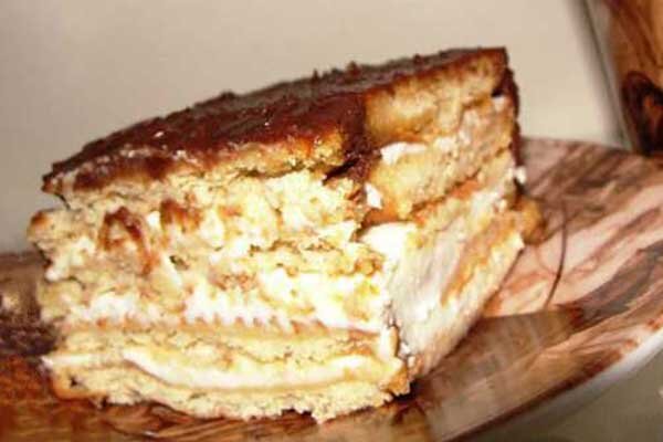 Такой торт сможет приготовить любая, даже хозяйка без опыта. Попробуйте и убедитесь в этом сами. В нашей семье частенько такой простой тортик красуется на столе по воскресным дням. Десерт можно уверенно отнести к бюджетному. Для его приготовления необходимо минимум ингредиентов, к тому же все они вполне доступные. Рекомендую, попробуйте обязательно, уверен он вам понравится. Если вам по случаю какого-нибудь торжества захочется сготовить, что-то сладенькое быстро и дёшево, то этот рецепт вас выручит. Времени на его приготовление потребуется немного, а результат порадует всех. Итак, что потребуется для приготовления торта без выпечки смотрите ниже… Необходимые для приготовления десерта ингредиенты: · Печенье — 450 Гр.; · Молоко — 300 Мл; · Творог — 350 Гр.; · Сахар — Три ст. ложки; · Сметана — Три ст. ложки; · Какао порошком — Одна ст. ложка. Инструкция по приготовлению: 1. Начнём с печенья. Для начала смочим его чуточку в молоке. 2. Затем берем творог и хорошенько его разотрем вил
