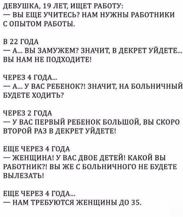 Женщина, пока у неё нет детей, она почти равна мужчине. В независимости, в свободе распоряжения своим временем и в свободе, передвижения, в праве на труд и самореализацию, в способности решать возникающие трудности. Чаще всего с появлением детей свобода исчезает. Как правило, надолго. К счастью, не у всех. Свобода передвижения? Прощай! Отныне ты рассчитываешь любые свои перемещения даже просто в пределах города, исходя из возможностей и потребностей детей. Сможешь ли ты здесь проехать с коляской, влезет ли коляска в общественный транспорт, уступят ли тебе место, если вместо коляски ты выбрала слинг или если ребёнок уже способен стоять, но не способен устоять при резком торможении? Не устроит ли чадо в пути истерику, не проголодается ли, не замёрзнет ли, не захочет ли внезапно в туалет, не будет ли ему чересчур жарко или душно, что приведёт или к нытью или к необходимости нести на себе полтора-два десятка килограммов. Ты теперь ориентируешься не на свою скорость ходьбы, а на его мале