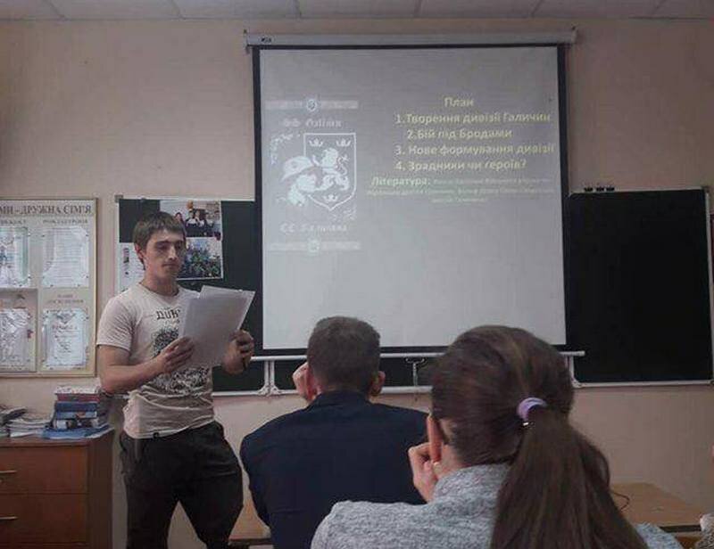 Ну правда они называют это «уроком мужества», чтобы вы понимали. На таких уроках рассказывают о примерах воинской доблести эсэсовских мразей из дивизии СС «Галичина» (нем. Waffen-Grenadier-Division der SS (galizische Nr. 1)). Лично я вижу на хлопце футболку «Дивизия Галичина» и кобуру. Что там на экране, думаю, понятно без пояснений. Как и ответ хлопчика на вопрос «зрадники или херои». Уроки нацизма в школах проводит организация Ukrainian military honor. "Зрадники или херои"? Вообще вопрос надо было бы не ставить. И как-то про предательство тоже мягкая постановка. Военные преступники или кровавые упыри? И то, и другое. Видите, как мягко они отводят фокус от главного? Для этого дебилам в футболках нужны квалифицированные консультанты. И, я так понимаю, они есть. Как и лояльность, разумеется, министерства образования. Ну вот такие они распространяют материалы. Украинцев из народа-победителя фашизма превращают в проигравших войну нацистов. Впрочем, возможно, это уже произошло. С чем