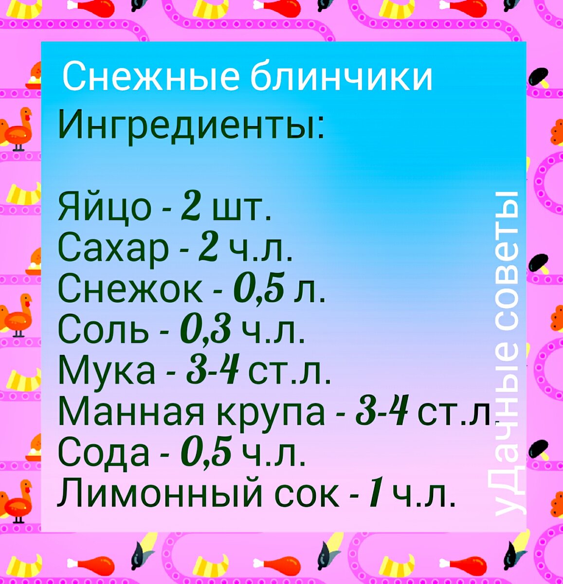 Этот рецепт - чистая импровизация, показавшая просто неожиданный результат. Домашние велели теперь печь блины только так! А "родился" рецепт из-за пакета всем знакомого кисломолочного напитка - Снежка, у которого оказался последний день срока годности. Пить такой снежок я не рискнула, а решила испечь из него блинчики. Ну а во время замешивания теста фантазия разыгралась и получилось нечто очень вкусное, нежное и в момент "улетевшее" с тарелки. Итак, миксером смешиваем яйца, сахар, соль и снежок до однородной массы. Следом отправляем в тесто три-четыре столовых ложки манной крупы и столько же муки. Вымешиваем до полного отсутствия комочков. Затем добавляем соду и лимонный сок (не возбраняется гасить соду уксусом). По желанию можно добавить пару столовых ложек растительного масла. В итоге должно получиться блинное тесто привычной консистенции. Обжариваем блинчики на небольшом количестве растительного масла с двух сторон до привычной блинной зарумяненности. Совет - чтобы блинчи