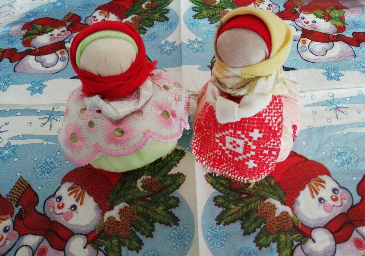 Находим середину полоски, завязываем узелок. Ручки куколки закрепляем нитками. Узелок должен находиться в центре головы. А сейчас переходим к изготовлению юбочки. В центральную часть квадрата 15*15 помещаем обрезки ткани либо вату и пятизначную монетку. Углы квадрата заворачиваем, чтобы получился круг, собираем юбочку складочками по краю. В серединку помещаем голову куклы и скрепляем с юбочкой нитками.