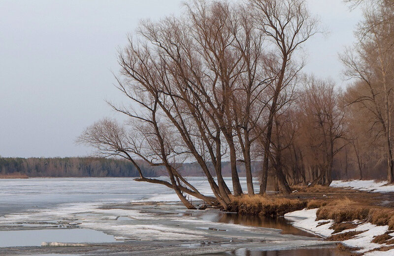 Радостно журчащие на солнце ручьи, вереницей бегут по склонам и обрывам берегов Оби, окончательно освободившихся от снежных завалов. Снег сходит и с земли, но ещё надолго остаётся в затемненных, спрятанных от солнечных лучей, местах. Всюду вода. Куда не наступи, земля оживленно всхлипывает под ногами.