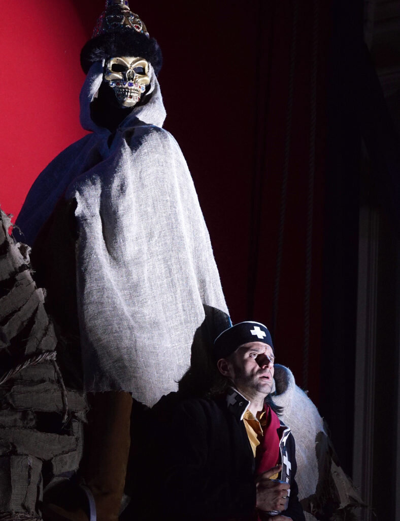 Но самая главная, центральная находка спектакля – это образ Грозного царя. В партитуре оперы этот герой, у которого нет ни единой реплики, да и самого его нет среди действующих лиц, присутствует незримо и очень явно. Петров визуализирует эту внешнюю по отношению к героям неумолимую силу, ломающую судьбы и жизни: на сцене восседающий на лошади скелет в шапке Мономаха – сама коронованная смерть, несущая горе и несчастье всем и вся, она же – олицетворение слепой и жестокой системы, само воплощение духа произвола, несвободы и безграничного самовластия.