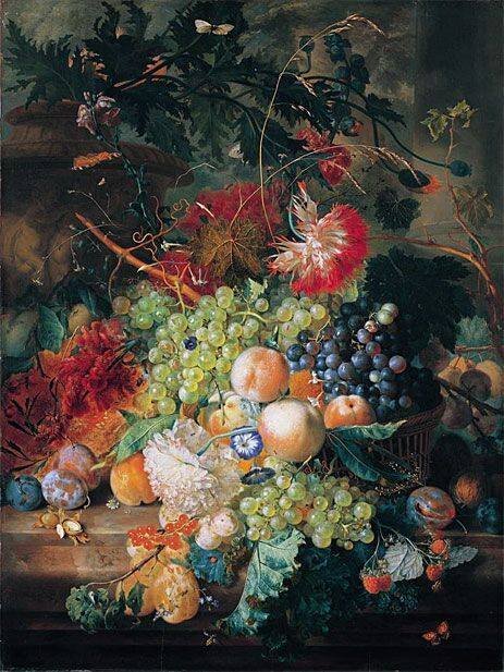 Jan van Huysum, also spelled Huijsum (15 April 1682 – 8 February 1749), was a Dutch painter. He was the brother of Jacob van Huysum, the son of the flower painter Justus van Huysum, and the grandson of Jan van Huysum I, who is said to have been expeditious in decorating doorways, screens and vases. A picture by Justus is preserved in the gallery of Brunswick, representing "Orpheus and the Beasts in a wooded landscape", and here we have some explanation of his son's fondness for landscapes of a conventional and Arcadian kind; for Jan van Huysum, though skilled as a painter of still life, believed himself to possess the genius of a landscape painter. Jan van Huysum's daughter, Francina Margaretha van Huysum, was also a flower painter and may have assisted her father in his work. Half of his pictures in public galleries are landscapes, views of imaginary lakes and harbours with impossible ruins and classic edifices, and woods of tall and motionless trees-the whole very glossy and smoot