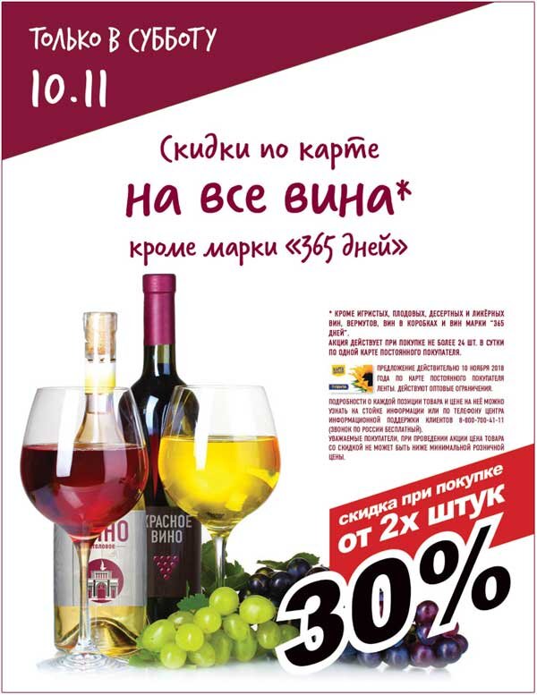 10 ноября в "Ленте" будут давать скидку на вино в размере 30% при покупке от двух бутылок. Игристое, плодовое, десертное и ликерное, а также вермуты в акции не участвуют. Неделю назад была немного другая схема - скидка 50% при покупке 6 бутылок и более, если менее 6 бутылок - 30%. Создается впечатление, что в "Ленте" не очень знают, чего же они собственно хотят. Точнее понятно, что они хотят продаж каких-то в винном отделе, а ставить хорошие ценники им претит. И вот они ищут партизанские окольные тропы и маркетинговые ходы, а цели все никак не достигнут. Ну не странно ли. Удивляет опять же, что на кетчупы, мороженое или торты "Лента" легко и непринужденно, с завидной регулярностью, устраивает все эти скидки одного дня - то 40%, то 50%, то 30%. Без ограничений и дополнительных условий чаще всего. Купил колбасу - вот тебе скидка, ни про какие два или пять килограммов речи не идет. Что ж с вином-то "Ленте" так трудно расстаться. Скидка 30% при покупке двух бутылок - при нынеш
