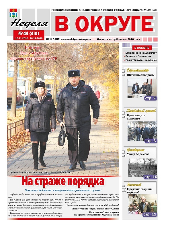 10 ноября в России отмечается День сотрудника органов внутренних дел. Глава городского округа Виктор Азаров и председатель Совета депутатов Андрей Гореликов обратились с добрыми словами ко всем, кто ежедневно находится на страже общественного порядка. А мы, в свою очередь, в новом выпуске газеты №44 «Неделя в округе» расскажем вам о том, как прошло торжественное мероприятие, приуроченное к этому празднику, и познакомим вас с участковым уполномоченным 2-го отдела полиции.
