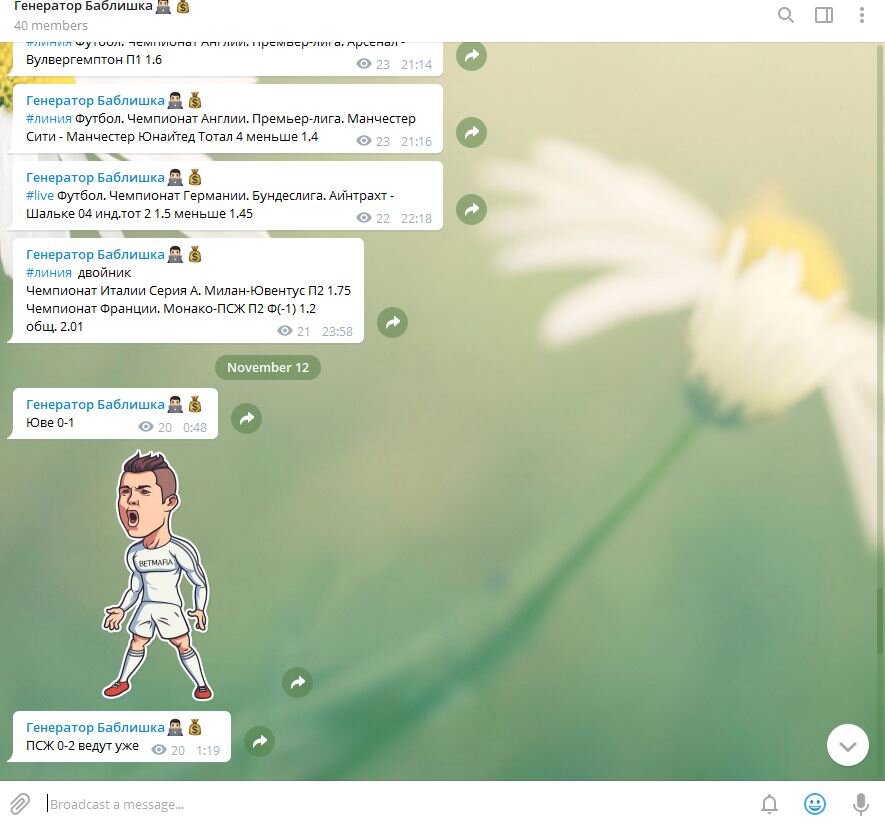 Всем привет! Хочу поделиться с вами моими наработками в сфере ставок на спорт, я создал телеграмм бота, где приходят только отборные сигналы, в основном это футбол и теннис, заложенные на определенных стратегий и статистики ,которые прошли куча тестов и принесли много прибыли. Я предлагаю вам протестировать на себе моего бота ,делая ставки флэтом строго (3-5%) от своего банка ,вы выйдете в плюс уже с первого дня, в среднем мы делаем от 150-300% от первоначального банка , бывают взлеты и лузстрики ,но на дистанции все работает на ура!Я буду делиться с вами своими результатами ,давать много полезной информации в мире ставок и в спорте в целом. Кому интересно улучшить свой уровень жизни велком!) Вступайте в телеграмм канал,куда будут приходить сигналы от бота: https://t.me/generatormany Ведётся ежедневная открытая статистика +/- в нём каждый день приходят сигналы автоматически, вам нужно просто зайти в букмекерскую контору и сделать такую же ставку, какую вам прислал бот. Всем мир!
