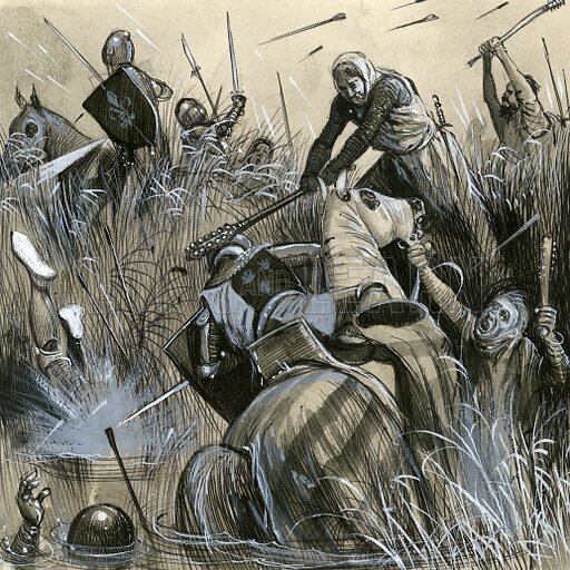 В июле 1302 года к фламандскому городу Куртре подошла французская армия с целью усмирить мятежников. Фламандцы основательно подготовились к этому столкновению: несколько округов выставили не менее 7-ми тысяч воинов. Местное дворянство относилось лояльно к французскому королю, поэтому рыцарская конница почти отсутствовала в рядах восставших. Размеры обоих войск были примерно равны, но существенная разница состояла в том, что во французской армии 11 июля присутствовало около 2-2,5 тысяч рыцарей и оруженосцев, а во фламандской - несколько сотен. В ходе самого сражения пешее ополчение уверенно отражало атаки тяжелой конницы, используя для этого древковое оружие, вроде продолговатых дубин-годендагов с острыми наконечниками из железа. Это было ужасное избиение самонадеянной французской знати: погибло от 700 до 1000 рыцарей (списки потерь в хрониках расписаны на несколько страниц!). Фламандская пехота столь же успешно использовала преимущества местности, как и наши следующие герои - швейцарцы. (Читайте подробнее о битве при Куртре)