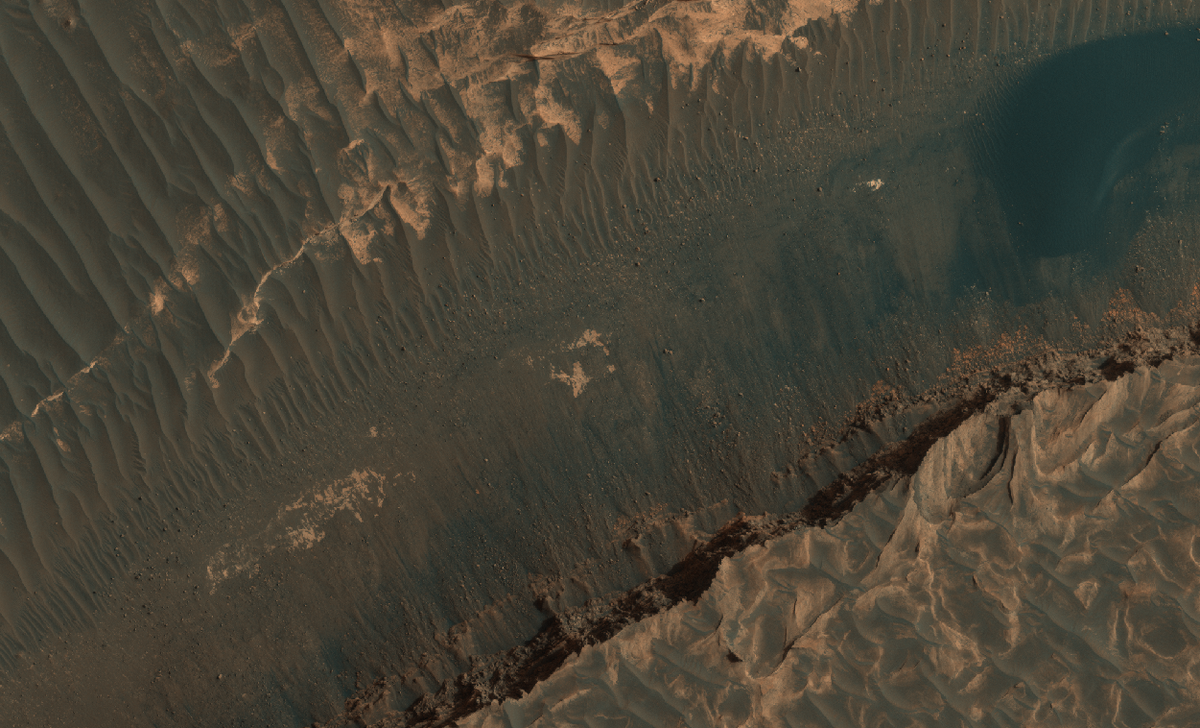 Жемчужный хаос (Margaritifer Chaos) - обширный участок на Марсе, который в прошлом был практически полностью покрыт водой. К данной области ученые проявляют особый интерес, так как именно там до сих пор могут обитать представители простейших форм жизни. Грунт Жемчужного хаоса насыщен железом и марганцем, которые придают специфический цвет. Исследование региона при помощи мультиспектрометра CRISM позволило установить присутствие филлосиликатов - слюда, хлорит, серпентин, тальк и большое количество глинистых минералов. Именно глинистые минералы указывают на то, что участок продолжительное время находился под водой. Куда делась вода на Марсе? После катаклизма или серии катаклизмов часть воды испарилась, а другая часть "всосалась" в грунт и на данный момент находится в недрах в замороженном состоянии. Предлагаем вам отправиться в виртуальное путешествие над Жемчужным хаосом Марса на высоте 266 километров. Масштаб: 25 сантиметров на пиксель.