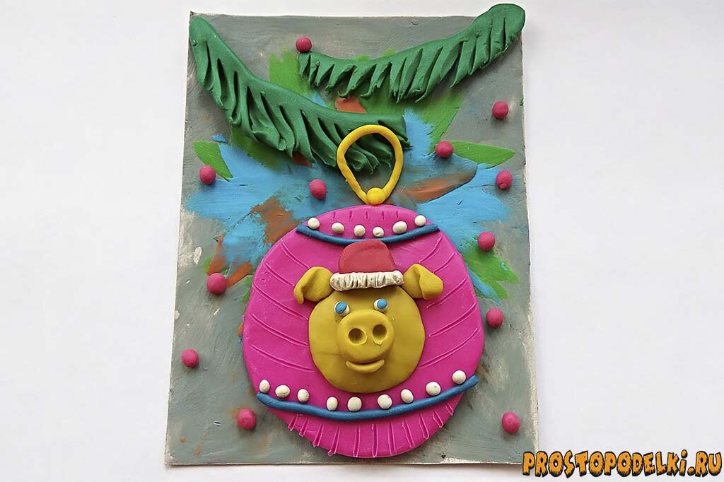 К Новому году мы нарядим елочку разноцветной мишурой, яркими шариками и сверкающими гирляндами. Это горячо любимый праздник для взрослых и детей, который все ожидают зимой. С нетерпением мы ждем чуда и Деда Мороза с большим мешком подарков. Маленькие сувениры – это еще один повод сделать друг другу приятное, поднять настроение. Из года в год мы покупаем всевозможные безделушки, которые символизируют животных будущего года по китайскому гороскопу. И к нам грядет эпоха добродушной желтой свиньи. Нужно присмотреться к этой упитанной красавице, которая обязательно принесет удачу в дом в новом году. Всегда интересно почитать информацию о том, какие перемены нас ждут, как лучше встречать праздник, что подготовить к нему. В этом уроке предложен интересный вариант аппликации - открытки к Новому году, выполненный из пластилина. Изображен на открытке елочный шарик, а сам шарик декорирован мордочкой свинки. Таким образом, полностью прослеживается новогодняя тематика, а также использован символ бу