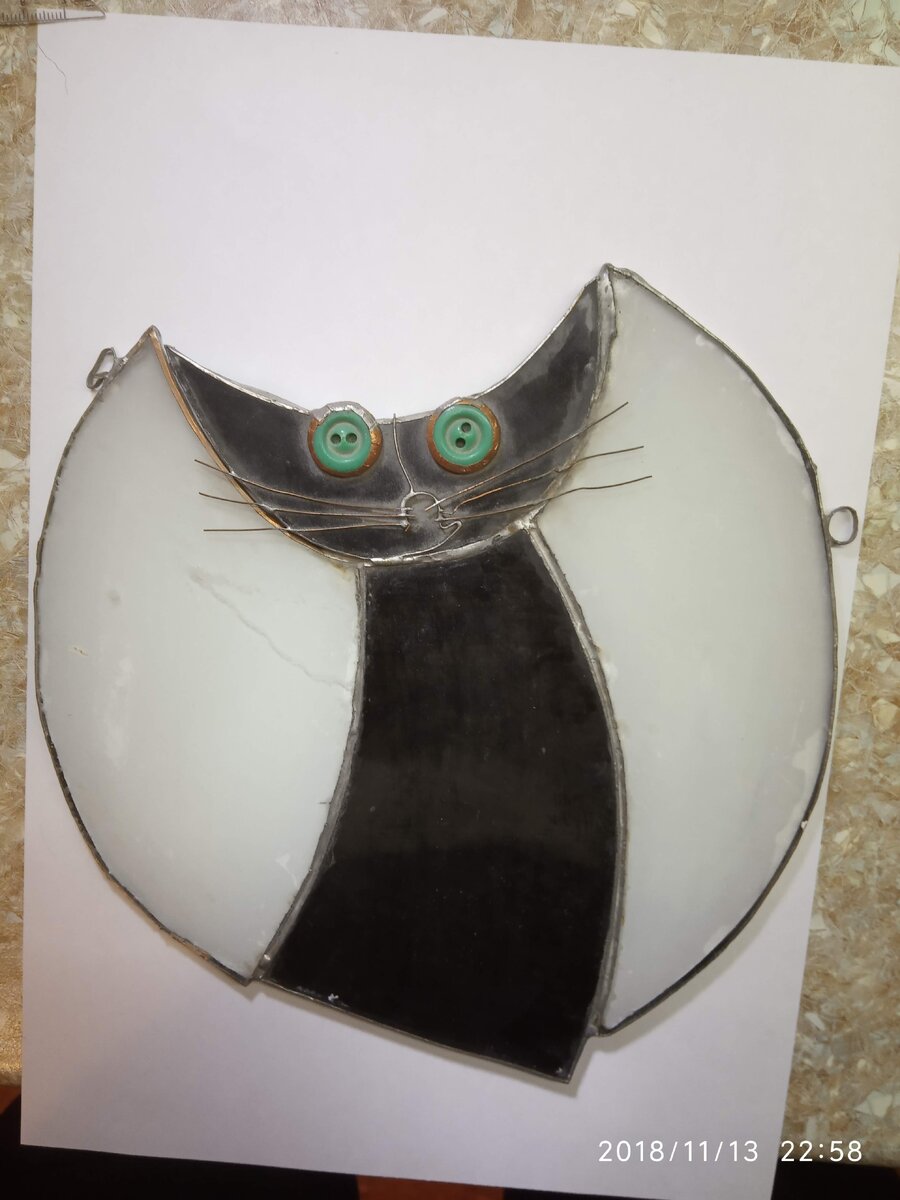 Это очень интересная техника. Обычные витражи - громоздки. Они требуют специальных свинцовых направляющих и не позволяют создать небольшие изделия с высокой детализацией. Еще в 19 веке, американский ювелир, по фамилии Тиффани, и, просто, очень талантливый человек придумал технику соединения кусочков стекла с помощью медной фольги. Сейчас достаточно легко найти недорогое цветное стекло или его бой, а также специальную фольгу с клейким слоем, чтобы ваять витражные украшения. Когда-то я купил такую фольгу, а вот стекло не нашел. Зато у меня был кусок старого оконного 4мм стекла и витражные краски, а так же запекаемые краски для керамики. Пока запал не прогорел, я попробовал вырезать из стекла заготовки и их раскрасить. Вот первая штучка, которая вышла достаточно нормально, чтобы показать кому-то: за годы лежания на антресоли - кошк запылился. Может это смотрится некрасиво и криво (вы не видите, на сколько это криво!), но каждый кусочек вырезан из отдельного стекла и не применялся точил