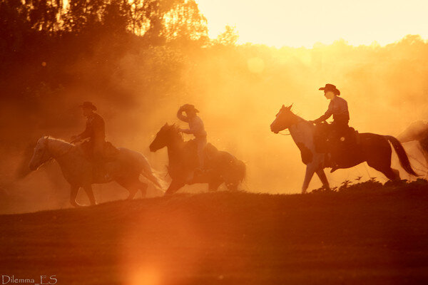 Нет, они не были ковбоями, потому как никогда не пасли коров. Просто три всадника — два мужчины и девушка с огнестрельным оружием начала ХХ века в прерии. Даже два всадника, мужчина (пусть он будет Джонни), точно имени не помню) и девушка преследуют третьего, который недавно отделился от них. Вот едет эта парочка по прерии и ругается. Девушка выносит мозг Джонни за то, что тот своими заумными разговорами так осточертел их лидеру, что тот бросил их обоих. Видимо захотел пожить в тишине. А то что Джонни заумничал, так он просто рассказывал, что будет с их миром в будущем. И не его вина, что его не понимали. Правда он и сам многого не понимал, потому как информация, вливавшаяся в его не осквернённый образованием мозг из неизвестного источника уж слишком сильно декодировалась в процессе объяснения. Последний пример — девушка спрашивает, что если всё так как он говорит, то на чём будут ездить автомобили, если не на угле? На что Джонни уверенно объяснял, что они будут передвигаться с помощью