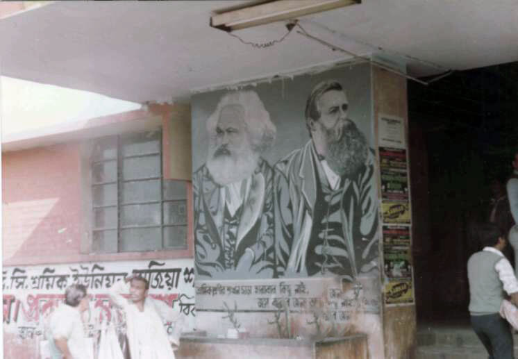 На стене железнодорожного вокзала Дургапура нарисованы портреты Карла Маркса и Фридриха Энгельса. Штат Западная Бенгалия является марксистским штатом. Даже в городе, на жилых домах можно видеть скрещенные серп и молот и надписи на бенгальском под ними. Приближались выборы. Заборы и дома, в качестве агитации, пестрели рисунками. Учитывая, что большинство населения неграмотное, каждая партия имеет свой символ, который и рисуется на заборе. Даже стены внутри завода перед выборами были расписаны предвыборными лозунгами, но директор по маркетингу господин Вачер дал команду смыть все лозунги, надписи, рисунки. Помнится, один из советских специалистов принес на завод рекламный буклетик и спросил начальника цеха, что это за партия и чего хотят эти люди. «Это коммунистическая партия Индии, - был ответ, - они хотят ничего не делать и получать высокие зарплаты. Это, конечно, не те коммунисты, которые живут у вас в СССР». Перед выборами, члены какой-либо партии проходят по улицам строем