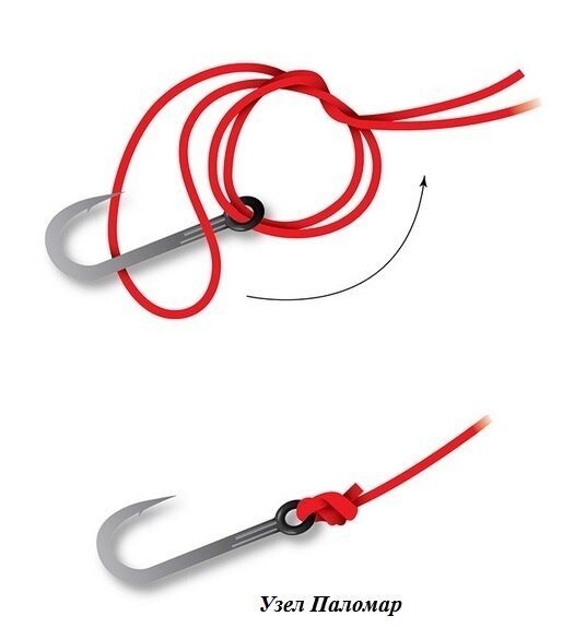 Одним из самых простых и популярных рыболовных узлов является узел Паломар. Одним из преимуществ этого узла является минимальные перегибы лески, что положительно сказывается на мощности этого узла. Узлом Паломар можно привязать крючок к леске или плетеному шнуру. Ниже приведена схема для этого узла. Обратите внимание, что при затягивании узла стоит его смочить, а ненужный конец не отрезайте до самого конца, оставьте небольшой кусочек лески, примерно 2-3 мм.