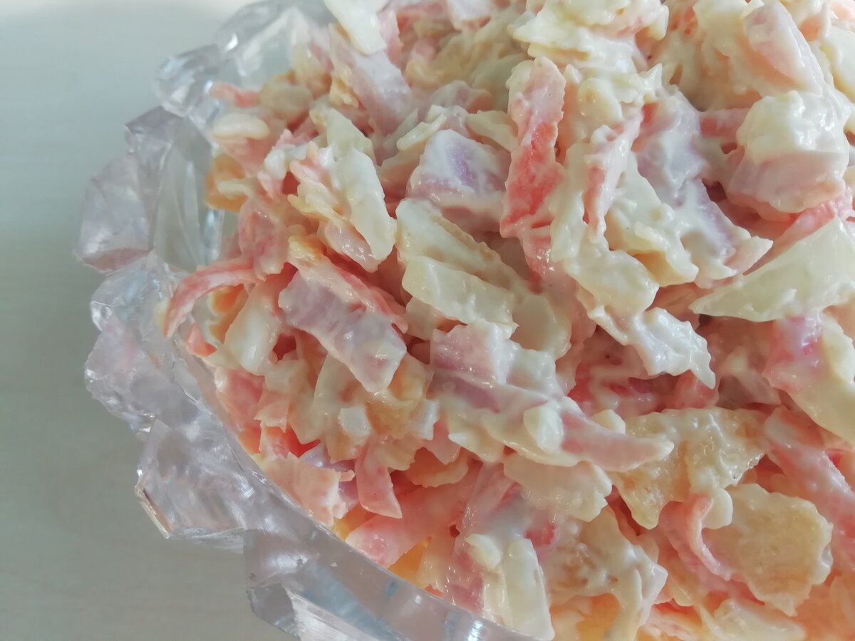 Если к вам нагрянули неожиданно гости, тогда вам обязательно пригодится быстрый рецепт салата с ветчиной, морковью и сыром. А для более пикантного вкуса, по желанию можно добавить немного картофельных чипсов и репчатого лука. Процесс приготовления не отнимет у вас много времени, а гости обязательно оценят ваши старания. Ингредиенты: Ветчина куриная 300 грамм Морковь 1 штука Сыр твердый 100 грамм Лук 1/2 штуки Чипсы со вкусом бекона 50 грамм Майонез по вкусу Приготовление: Ветчину режим мелкими брусочками. Также вместо ветчины можно использовать любую вареную колбасу. Сырую морковь чистим, моем и трем на крупной терке. Любой твердый сыр также трем на терке. Половину луковицы режем как можно мельче. Крошим чипсы, только не слишком мелко и отправляет к остальным ингредиентам. Заправляем майонезом, хорошо вымешиваем и выкладываем в салатник. Такой салат нужно сразу подавать к столу, пока чипсы хрустящие. Что бы не потерять рецепт, подписывайтесь на канал! Всем приятного аппетита!