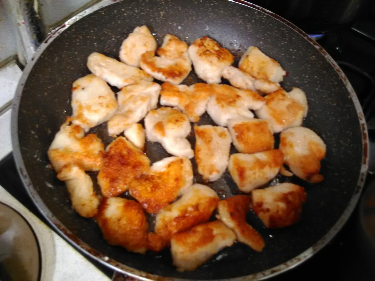 Наша семья жить не может без курицы и сегодня я приготовлю наггетсы и салат "типа Оливье" с курой. Разделываем курицу (как я раньше уже писала), грудку отделяем от кости (на наггетсы), ножки (на салат), крылышки (убираем в морозилку - копим на крылышки "барбекю"), скелет оставим на суп. Ножки на салат ставим вариться: Так же ставим вариться овощи (картофель и морковь в мундире): Тем временем режем грудку на кусочки, солим, перчим: обваливаем в муке или панировочных сухарях: Обжариваем с двух сторон до хрустящей корочки (лично я после этого томлю под крышкой еще минут 30-40, что убить всех сальмонелл и тому прочую гадость), но тут на любителя - у всех свое время приготовления. Пока готовятся наггетсы - уже сварились овощи и кура, их мы охлаждаем, варим яйца: начинаем нарезать салат - лук и горошек: яйца и отделяем куру от кости: режем остывшие овощи: Я совсем забыла в магазине про соленые огурцы, пришлось достать из кладовочки маринованные кабачки с огурчиками: огурчики тоже крошим в са