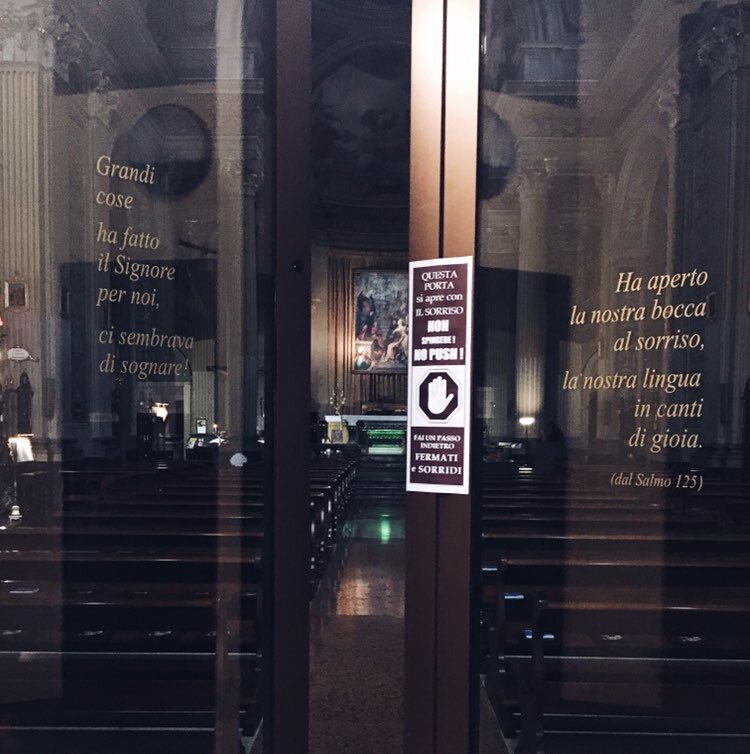 В самом центре университетского квартала итальянского города Болонья находится церковь Santa Maria Maddalena. Храм насчитывает не одно столетие и довольно любопытен внутри. Многие итальянские церкви имеют три входные двери: две небольшие боковые и одну центральную, которая, как правило, открывается по случаю каких-либо праздников. Но в церкви Santa Maria Maddalena центральную дверь может открыть любой… с помощью улыбки. Дверь, в которую вмонтирована веб-камера, автоматически реагирующая на улыбку, была придумана двумя местными художниками в 2012 году. Идея всем понравилась, и художники даже презентовали свой проект на биеннале современного искусства в Москве. Дверь приглянулась и настоятелю болонской церкви, который заказал такую же для храма. В будущем авторы проекта хотят установить подобные двери в разных городах и странах и соединить их в одну сеть. Таким образом от одной улыбки будут открываться двери в разных уголках мира. Подписывайтесь на мой канал в телеграме, где я чаще рас