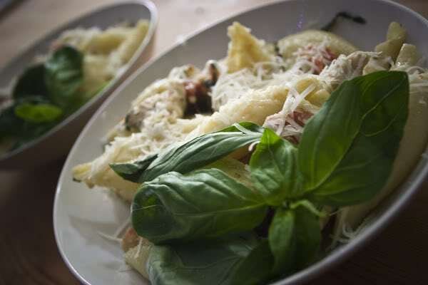 Ингредиенты: Разогреть в сковороде 1 столовую ложку масла из упаковки с высушенными на солнце томатами. Нарезать куриное филе небольшими кусочками и обжаривать в течение 4 минут на умеренно сильном огне. Мелко нарезать чеснок, базилик и прошутто. Добавить в сковороду еще 1 столовую ложку масла и чеснок, обжаривать 1 минуту. Влить в сковороду бульон, добавить базилик, горгонзолу, прошутто и высушенные на солнце томаты. Дать закипеть, а затем готовить 3 минуты на слабом огне, регулярно помешивая. Сварить пасту в подсоленной воде. Перемешать конкилье с соусом и готовить на слабом огне еще 3 минуты. Подавать пасту с тертым пармезаном, украсить веточкой свежего базилика. Приятного аппетита!