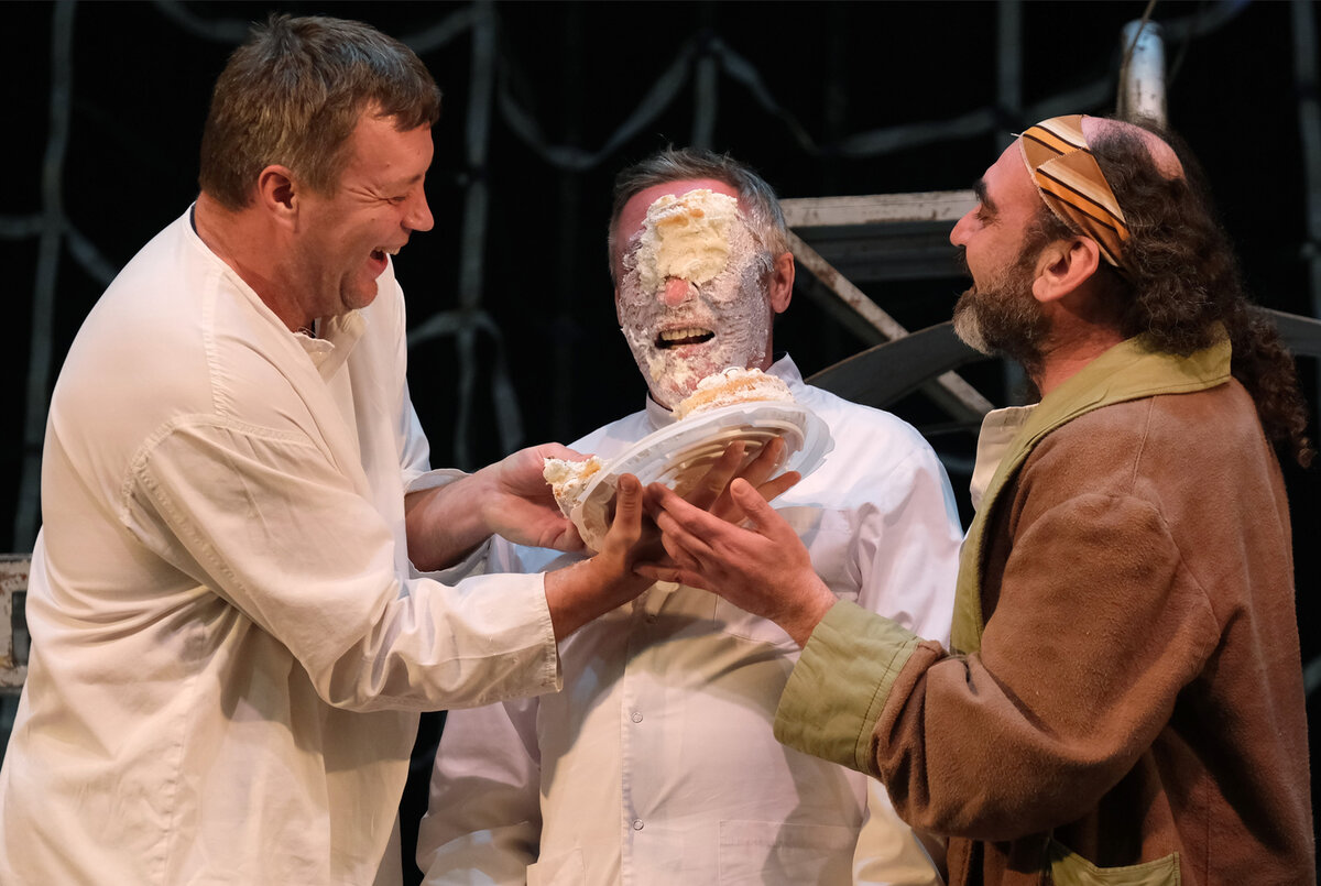 Такому артисту как - Михаилу Ефремову , на днях, 10 ноября исполнилось 55 лет, и его коллеги подумали, и решили сделать ему очень интересный и неожиданный сюрприз, который бы запомнился всем и надолго! Накануне своего дня рождения , он играл в спектакле под названием - "Чапаев и пустота", и во время выступления кто-то из актеров заехал ему тортом в лицо поздравив актера с его Днём Рождения. Во время данного выступление , торт вынесли так , чтобы Ефремов этого не заметил . И в самый неожиданный для него момент , пустили ему этот торт в лицо. Самому имениннику понравилась эта шутка в честь для его рождения, хоть и она была непредсказуемой. Зал поддержал эту шутку и начал громко аплодировать и поздравлять заслуженного артиста. Так же и все его коллеги на сцене, поздравили его с Днём Рождения и пожелали всего самого наилучшего. Через минуту все актёры переключились на спектакль, и он продолжился как ни в чём не бывало. Причём в дальнейшем спектакль прошёл успешно , и всем всё понравилось.