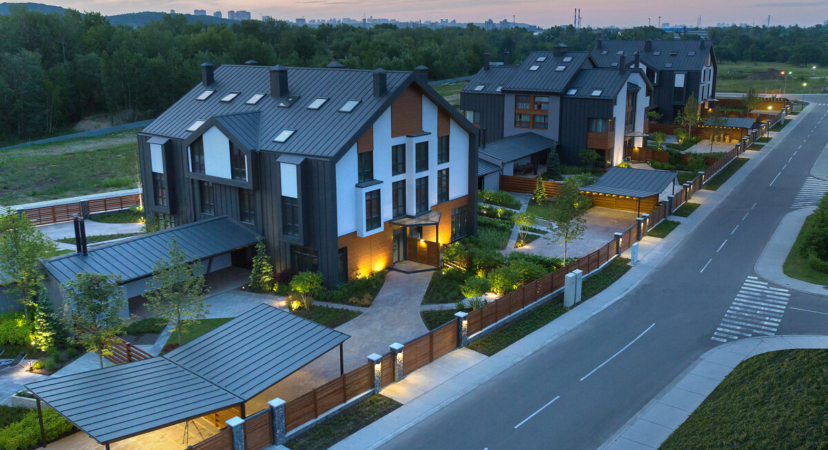 Проект QDRO - terraced house – это блокированный дома на 4 трехуровневые квартиры в Киевской области, Украина от студии Breus Oleksii. Объект имеет удобное расположение в 15 минутах езды от центра Киева. Замечательная инфраструктура коттеджного поселка, в котором находятся дом, подчеркивает его имидж на рынке недвижимости. Перед архитекторами стояла задача разработать современный каркасный дом и план благоустройства внутреннего двора, не забывая при этом про элементы благоустройства – навес для автомобилей и ограждения. В ходе проектирования, было рассмотрены различные варианты кровельных покрытий и отделочных материалов для фасада. Заказчик одобрил комбинацию оцинкованной стали и минеральной паропроницаемой штукатурки. Дизайнеры предложили несколько вариантов фасадов с этими материалами и оптимизировали поэтажные планы. В результате получили интересный комплекс из четырех современных домов и 16 автономных квартир. Каждая квартира имеет прилегающую благоустроенную территорию 500 квадра