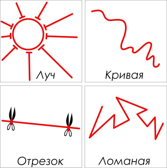 -прямая (для знакомства с ней возьмите линейку и проведите ровную прямую).