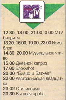 Дорогие друзья! В этом году телеканал Mtv Russia празднует свое 20-летие. За эти годы на этом культовом канале сменились десятки разных телепередач и ведущих, а на программах канала выросло не одно молодое поколение наших соотечественников. 20 летие - это время подвести итоги и посмотреть на то, что было хорошего за весь этот довольно-таки долгий путь. А хорошего было немало - все помнят легендарных Бивиса и Батхеда, 12 злобных зрителей, Тачка на прокачку, музыкальное чтиво и многие другие программы. Также многие помнят, как негативно относилось к контенту Мtv старшее поколение, и как ругало этот канал и отдельные его программы. Итак, давайте перенесемся на 20 лет назад, в 1999-й год, и посмотрим на один из эфирных дней этого канала. Что интересного показывали, и что не грех пересмотреть и сегодня. Понедельник, 3 мая 1999 года Напомним, что вещание канала в Москве и регионах России происходило с 12-30, поскольку МТВ делил эфир с другим телеканалом - Телеэкспо. 1. Биоритм Итак, в 12-3