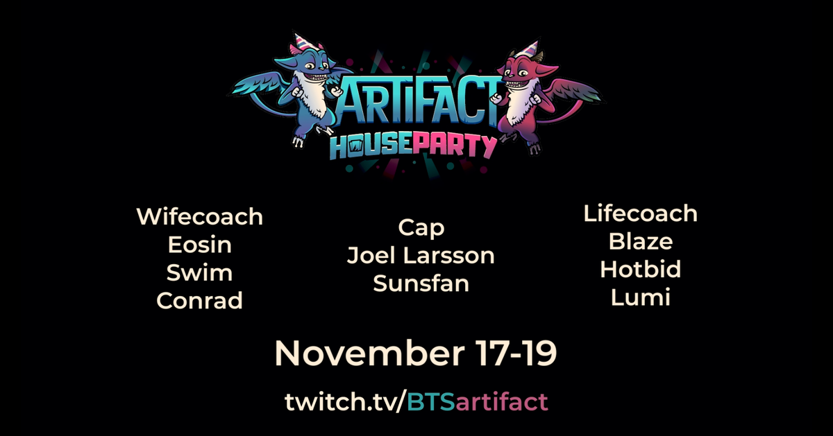 Студия BTS организует ивент Artiact House Party. Приглашённые гости два дня будут играть в развлекательные режимы (например, reverse draft, где игрок собирает колоду для соперника, а не себя. ), а с 19 ноября к веселью присоединятся бета-тестеры.