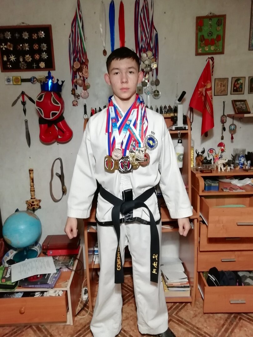 Никита: Тхэквондо я занимаюсь с 12 лет. Это уже 4 года. Начал просто за компанию. Знакомые ребята рассказали, что у них, в деревне Рабитицы, открылся кружок по тхэквондо и предложили попробовать. Я приехал, посмотрел, попробовал и втянулся. Совсем недавно сдал аттестацию на чёрный пояс. Начинал вообще без пояса. Через несколько месяцев аттестовался на белый пояс, к которому потом добавлялись жёлтые полоски, и так далее по нарастающей до чёрного пояса. Н: Кто поддерживает тебя в твоих стремлениях?
