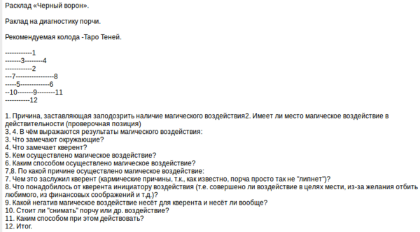 Кверентка. А можно расклад "чёрный ворон"? Я. Делаю. Я. П.1, причина, заставляющая запопозрить магическое воздействие - Мастер. Вам не дается мастерство в какой-то области? Будто что-то не пускает? Кверентка. Да, ничего не получается, топчусь на месте. Я. П.2, имеет ли место воздействие на самом деле - Игривость. Возможно, да, но не очень сильное, будто наложенное скорее кем-то играющим в мага, чем настоящим магом. Кверентка. Может, в сердцах кто-то что-то сказал? Я. Да, как вариант, дальше мы еще увидим подтверждение этому. П.3 и 4, в чем выражаются результаты маг. возвздействия - Обыденность плюс Цветение. Примерно то же, что вы сказали чуть выше, процветания не выходит, тянутся серые будни. Кверентка. Да. Я. П.5, кем осуществлено воздействие - Приключение. Разумеется, это необязательно ребенок в буквальном смысле, может быть, просто человек с природным неразвитым магическим даром. Кверентка. Возможно. Я. П.6, каким способом осуществлено - Источник. Да, похоже на "кто-то в сердцах чт