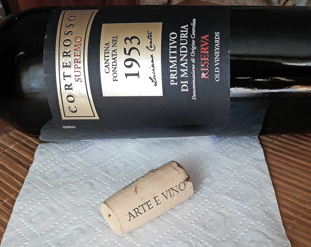 Вино "Corterosso Supremo Primitivo Di Manduria Riserva" - стабильная позиция в программе сети "Красное и Белое". Многие вина там мелькают и исчезают, "Кортероссо" пока остается. Выбор Примитиво на российском рынке не то чтобы большой. Поэтому каждое на виду, можно сказать. Импортирует "Кортероссо" компания "Полини Импорт". На русской этикетке производителем значится "Contri Spumanti", на родной контрэтикетке данные такие - "Imbottigliato da T.D.C. S.p.A - Cazzana di Tramigna - Italia". Адрес Каццано-ди-Траминья можно трактовать как - где-то в Вероне, а там каждый покажет. Название TDC тоже занимательное. Остается только верить, что импортер действительно знает, у кого купил вино. К тому же "Кортероссо" все-таки официальная линейка, на сайте "Contri Spumanti" присутствует. Зачем так шифроваться - загадка. Чисто внешне "Кортероссо" смотрится хорошо. Бутылка солидная, утяжеленный вариант. Этикетки качественные, полиграфия на уровне. О внутреннем мире. Алкоголь 15%, что конечно внушает. Ур