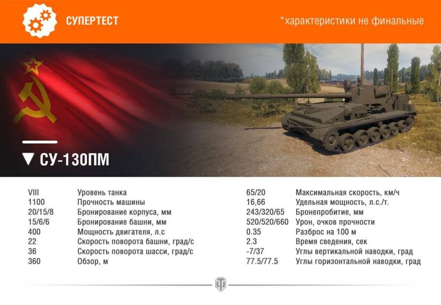 На супертесте появилась новая советская ПТ-САУ VIII премиум класса и уровня СУ-130ПМ. Танк вполне реален и имеет прототип, который можно найти в музее Кубинки. Игровая версия боевой техники СУ-130ПМ в игре имеет единственное отличие от реального танка — ее орудие имеет калибр 130 мм, благодаря чему оно мощнее, чем у реального танка. Благодаря маневренности Вы сможете без проблем изменить направление и позицию для стрельбы. Крайний показатель скорости машины — 65 км в час. Однако плохая проходимость может сыграть злую шутку, так как машина до максимума будет разгоняться лишь на хорошей дороге, но и в этом случае потребуется некоторое время. Крейсерская скорость движения составляет близко 45−55 км в час. Маскировка поможет выжить в схватке, также окажет помощь мобильность, если ее правильно использовать. Возникает вопрос, не лишенный логики — в чем заключается подвох? В том, что у танка очень низкая бронезащита (фугасы будут "заходить" нанося колоссальный урон) и всего 1100 единиц