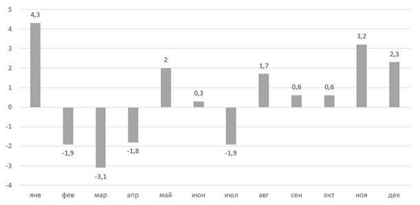 Динамика доллара против рубля, % (средняя динамика за 10 лет)