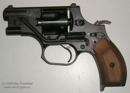 Бесшумный револьвер ОЦ-38 (Россия) Тактико-технические характеристики УСМ револьвер двойного действия Калибр 7.62х42мм СП-4 Вес без патронов 880 г (с интегральным ЛЦУ) Длина 191 мм Емкость барабана 5 патронов Бесшумный револьвер ОЦ-38 разработан ныне уже покойным Игорем Яковлевичем Стечкиным в ЦКИБ СОО (ныне - филиал КБ Приборостроения, Тула). ОЦ-38 разработан как альтернатива бесшумному пистолету ПСС под тот же бесшумный специальный патрон СП-4, и предназначен для вооружения оперативников ФСБ и других правоохранительных органов России. Револьвер ОЦ-38 производится небольшими партиями по спецзаказам. Бесшумный револьвер ОЦ-38 является одним из наиболее необычных с конструктивной точки зрения современных револьверов. Во-первых, его самовзводный ударно-спусковой механизм с открытым курком оснащен ручным предохранителем (расположенным на обеих сторонах рамки), обеспечивающим безопасное ношение оружия с взведенным курком для обеспечения первого выстрела с максимальной быст