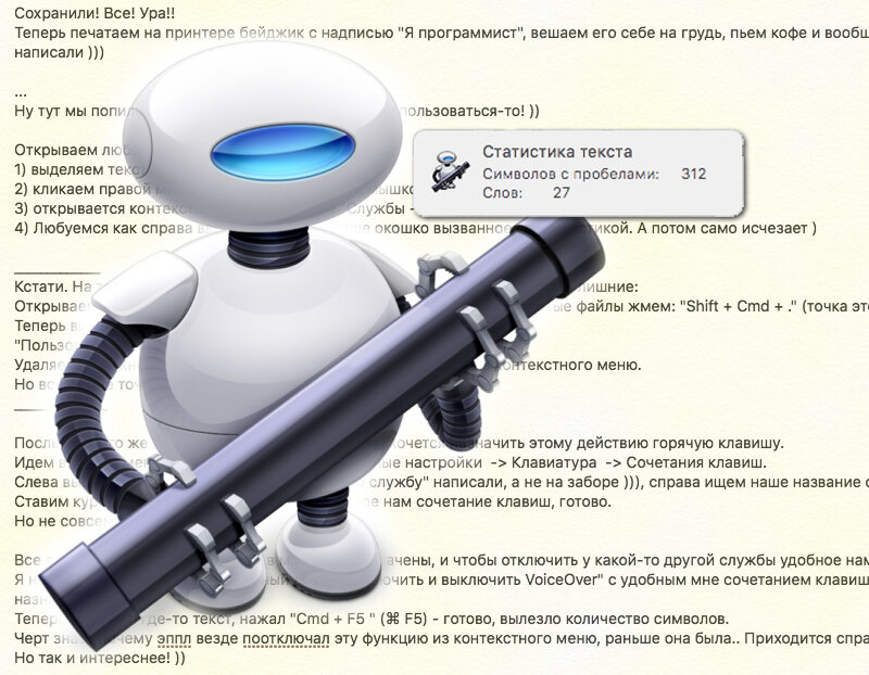 Теперь: выделил где-то текст, нажал "Cmd + F5 " (⌘ F5) - готово, вылезло количество символов.