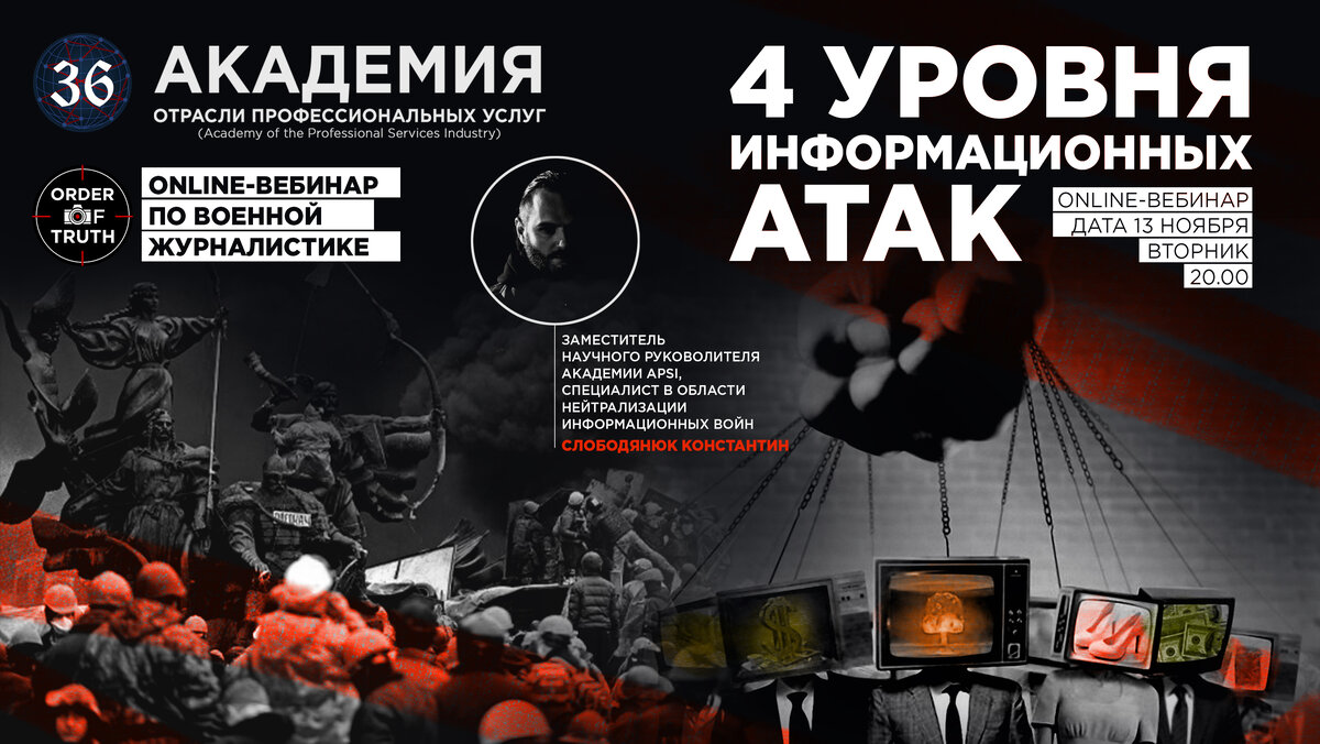 УЖЕ ЗАВТРА!️ 13 ноября в 20:00 состоится вебинар по военной журналистике "4 уровня информационных атак"! 🌐 Ни для кого не секрет, что в XXI веке одним из главных видов оружия является информация. А с возникновением интернета у информации перестали существовать границы, она способна проникать практически в любые уголки мира. Это оружие уже сегодня активно применяется многими структурами, начиная от бизнеса и заканчивая государствами. ▶️ Именно в этот момент профессия военного журналиста, способного разобраться в информационной атаке и погасить ее становится ценнее с каждым днем. А для противостояния любой атаке, необходима классифкация. Именно об этой классификации пойдет речь на вебинаре "4 уровня информационных атак". ✅ Вебинар проведет заместитель научного руководителя Академии APSI, специалист в области нейтрализации информационных войн - Слободянюк Константин Владимирович. ❗️Вебинар пройдет в рамках отбора сотрудников в агентство военной журналистики "Order of the truth". 📝▶️ Дл