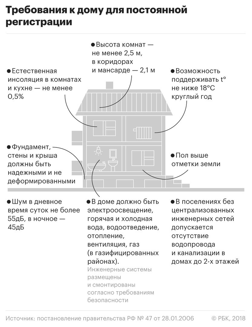 🏁🏁Критерии дачного дома «с пропиской»🏁🏁 Что изменилось Для получения постоянной регистрации по новому закону загородный дом должен быть капитальным, иметь коммуникации и соответствовать требованиям для круглогодичного проживания. Для этого собственнику придется доказать, что строение пригодно для постоянной эксплуатации. Все параметры для определения этих критериев описывается в постановлении правительства № 47 от 28.01.2006. 📊📊Критерии дачного дома «с пропиской»📊📊 Конструкции здания должны быть надежной. Фундамент, несущие стены и крыша должны быть в одинаково хорошем состоянии (без трещин и деформации), а внешние стены теплоизолированны. Высота и площадь строения должны соответствовать действующим нормам с учетом района расположения. В доме должны быть проведены инженерные коммуникации: электроосвещение, горячая и холодная вода, водоотведение, отопление, вентиляция, газ (в газифицированных районах). Системы должны быть размещены и смонтированы согласно требованиям безопасно