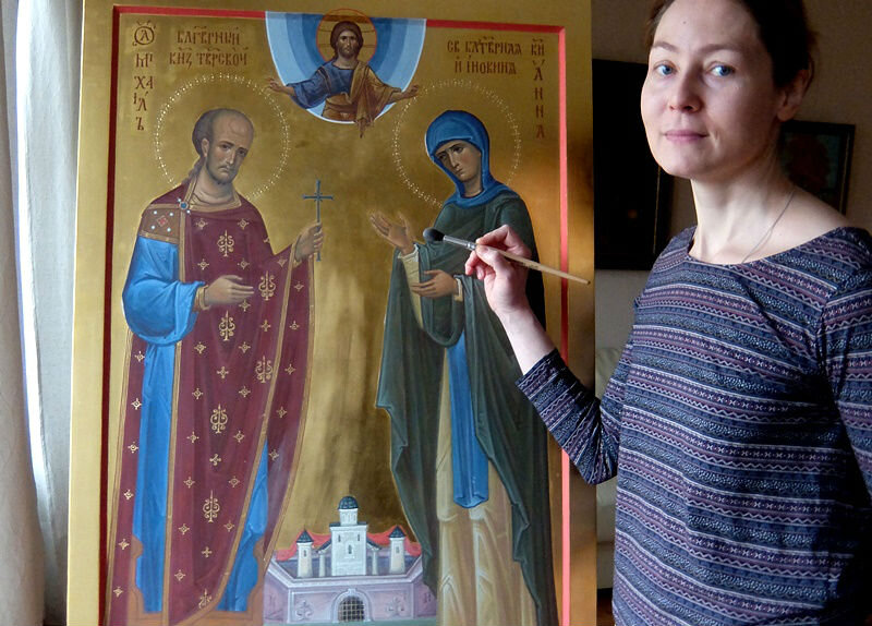 Икона небесных покровителей Тверского края написана иконописцем Еленой Антоновой в необычном для подобных образов стиле. Михаил Тверской – единственный князь эпохи русского средневековья, от которого осталось прижизненное изображение, сохранившееся в тверском списке "Хроники Георгия Амартола" ХIII-начала ХIV в.в. Именно этот образ, близкий к историческому портрету святого, взят за основу при создании иконы.