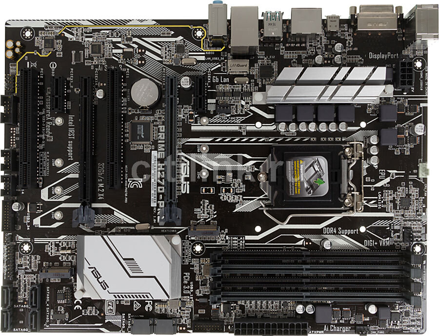 - ASUS PRIME H270M-PLUS – перспективная бюджетная плата с двумя слотами под видеокарту, четырьмя разъемами для оперативной памяти типа DDR4, и классическим чипсетом Intel H270. Размеры материнской платы – Micro-ATX, а, значит, появится шанс построить нестандартную развлекательную систему компактных размеров.