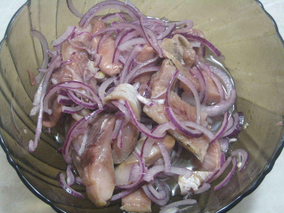 Здравствуйте, друзья. Сегодня я хочу вам представить простейший рецепт отличной закуски из слабосоленой селедочки. Приготовить ее можно за несколько минут и она отлично подойдет к любому приготовленному картофелю, а в качестве закуски, по моему мнению, ей нет равных. К тому же получается очень бюджетно. Для приготовления нам понадобится: одна или две слабосоленых селедки, 1-2 головки репчатого лука (обычного или салатного), немного уксуса (лучше винного, но подойдет и обычный) и также немного растительного масла. Селедку мы солим дома сами, но можно и просто купить ее в магазине. Главное, чтобы она была действительно слабосоленой. Если она будет очень соленой это испортит весь вкус. Для начала, селедку нужно выпотрошить, удалить голову и все кости, чтобы получилось филе. Икру и молоки мы не выбрасываем, а также добавляем в эту закуску. Берем очищенное от костей филе, режем его на небольшие куски и складываем в миску. Туда же добавляем порезанную икру или молоки. Режем лук полукольцам