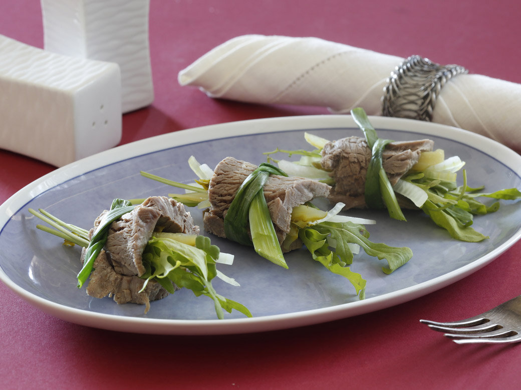 На каждую пластину мяса положить 2–3 салатных листа, маринованный лук и немного соленых огурцов. Свернуть рулетом и перевязать пером зеленого лука. Шаг 6