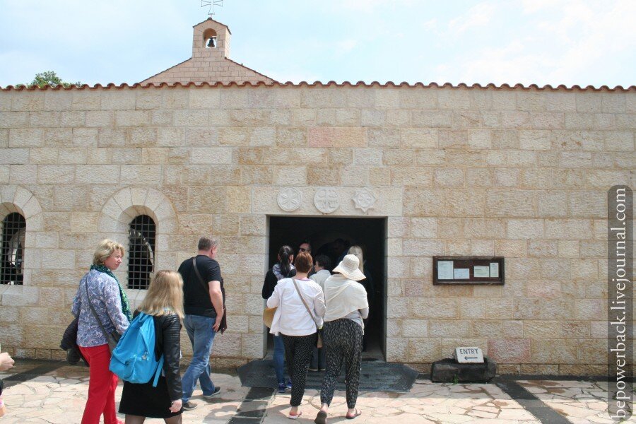 Далее мы подъехали к церкви Умножения хлебов и рыб в Табхе, воздвигнутой на месте, где согласно христианской традиции произошло чудесное умножение хлебов и рыб Иисусом Христом. Современная церковь построена в 1982 г. на византийском фундаменте и является точной репродукцией церкви VI в.