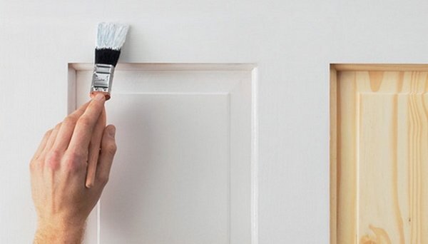 Затем подготовьтесь к покраске: заклейте поверхности, не требующие окрашивания, малярным скотчем. Таким образом они будут защищены от попадания краски или лака. Под дверь подложите картон, чтобы не пачкать пол. При окрашивании двери краску наносите по горизонтали и тут же растушевывайте ее по вертикали кистями или валиками. Наносите покрытие тонким и ровным слоем. Окрашивая наличники, краску растушевывают по их длине. Если поверхность двери гладкая, то окраску начинают с левого верхнего угла, затем покрывают участки рядом и так далее, спускаясь вниз.