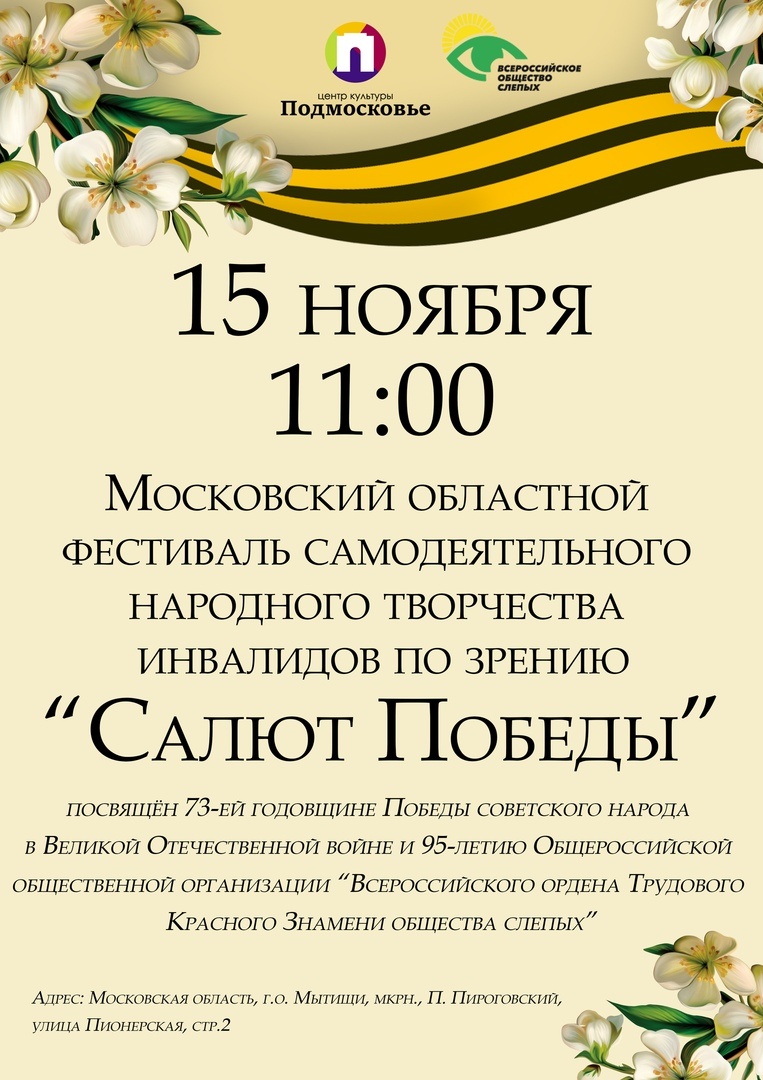15 ноября в 11.00 в ЦК "Подмосковье" состоится первый фестиваль самодеятельного народного творчества инвалидов по зрению "Салют Победы", посвященный 73-й годовщине Победы советского народа в Великой Отечественной войне и 95-летию Общероссийской общественной организации "Всероссийского ордена Трудового Красного Знамени общества слепых".